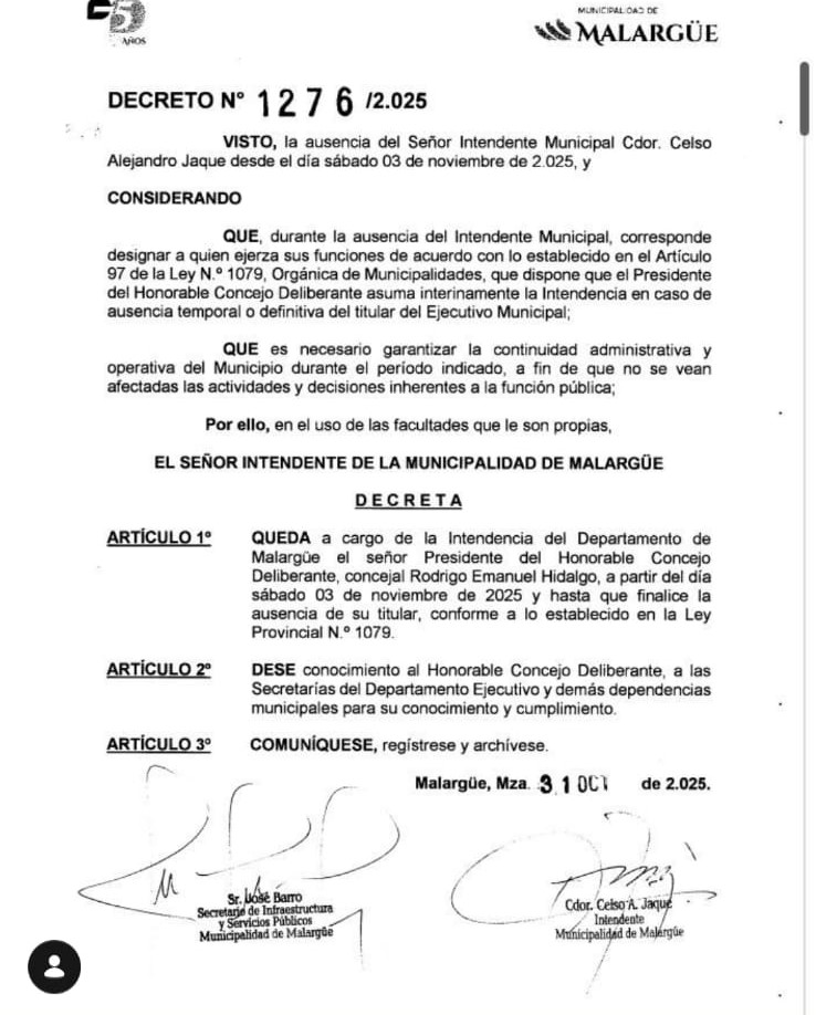 La ausencia del intendente de Malargüe continúa generando interrogantes en el ámbito local, luego de que se conociera un decreto municipal que designa al presidente del Honorable Concejo Deliberante, Rodrigo Emanuel Hidalgo, como intendente interino.