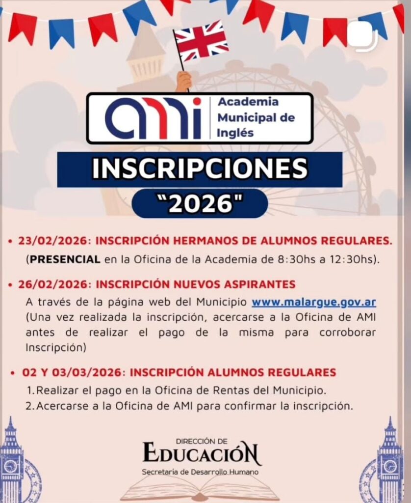 La Dirección de Educación, dependiente de la Secretaría de Desarrollo Humano, informó el cronograma de inscripciones para el ciclo lectivo 2026 de la Academia Municipal de Inglés (AMI), destinado a alumnos regulares, hermanos de estudiantes y nuevos aspirantes.