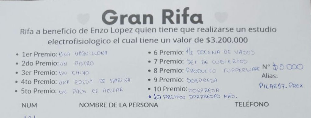 “Estamos pidiendo la colaboración de Malargüe para poder hacerme una operación que es muy cara”, expresó Enzo, quien explicó que se encuentra organizando una rifa solidaria con premios donados. “Tengo muchos amigos y familiares que me están ayudando a vender los números”, agregó.